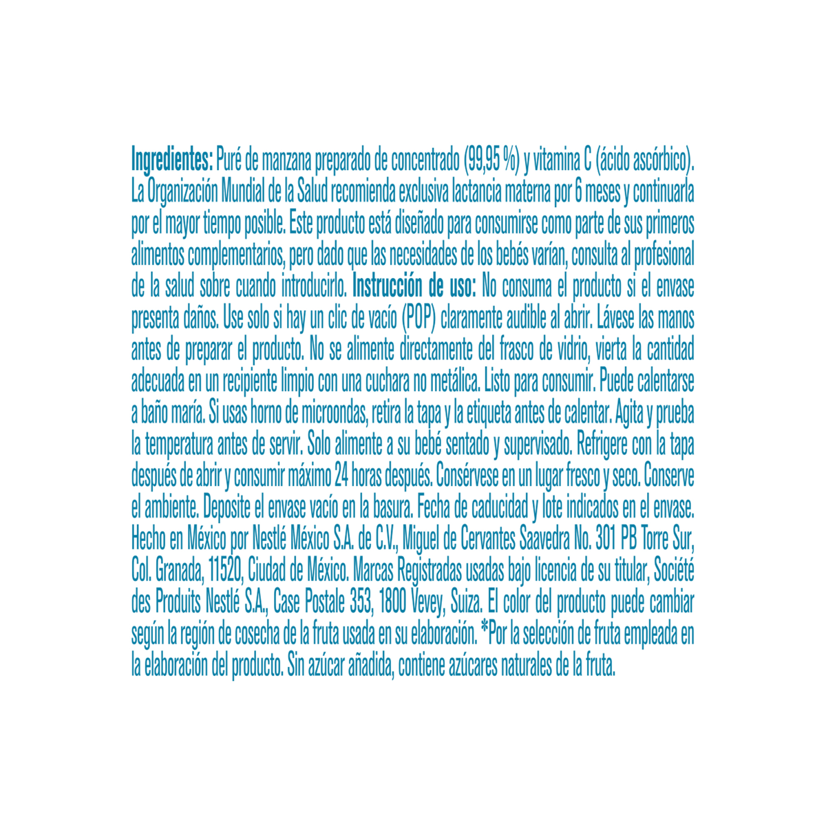 La primera papilla de frutas Gerber sabor manzana es un alimento para bebé de 6 meses de edad, vienen de un solo sabor para ser la primera comida del bebé adecuada donde pueda comenzar a descubrir nuevos sabores de forma gradual. Las papillas de 6 meses Gerber son la comida para bebé: -Fortificada con Vitamina C. -Porción adecuada para la edad de tu bebé. -Sin azúcar añadida. -Sin sal añadida. -Sin conservadores químicos. -Sin saborizante artificiales. -Sin colorantes artificiales. Ayuda a tu bebé para que descubra todos los sabores de Gerber. Dale lo mejor a tu bebé y sigue su desarrollo en cada etapa. Gerber: Por tu bebé, todo.