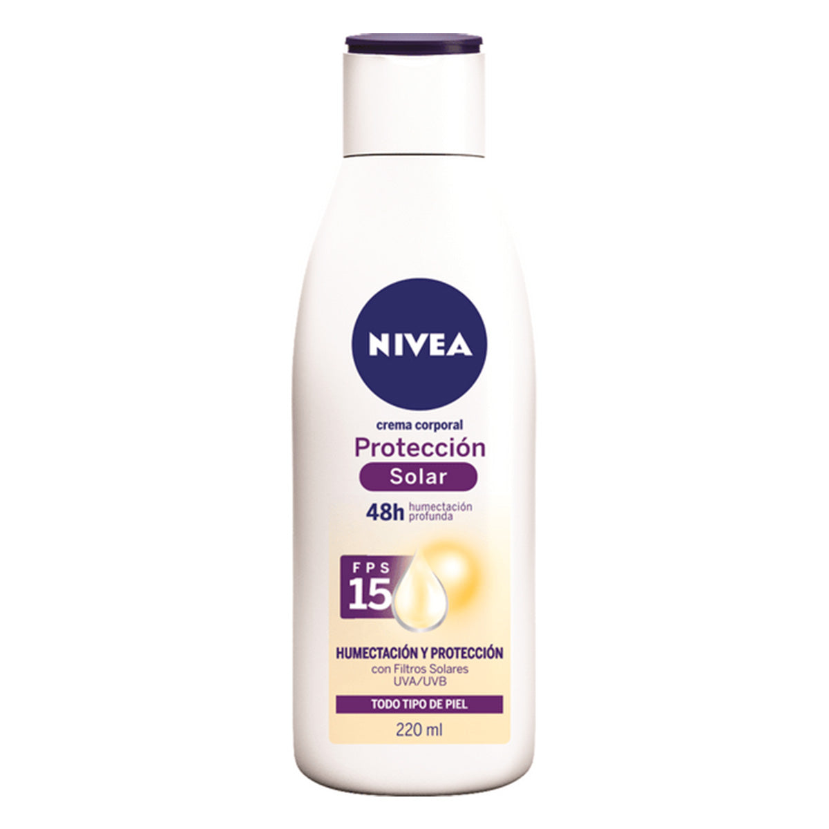 Crema Corporal Nivea Protección Solar Es Una Crema Corporal Especialmente Formulada Con Filtros Solares Uva Y Uvb Con Fps 15 Que Protegen A La Piel De Los Efectos Dañinos En Una Presentación De 220 Gramos, Dale A Tu Cuerpo Una Sensación De Suavidad. Nutrición Y Humectación Profunda. Con Aceite De Almendras. Para Uso Diario.