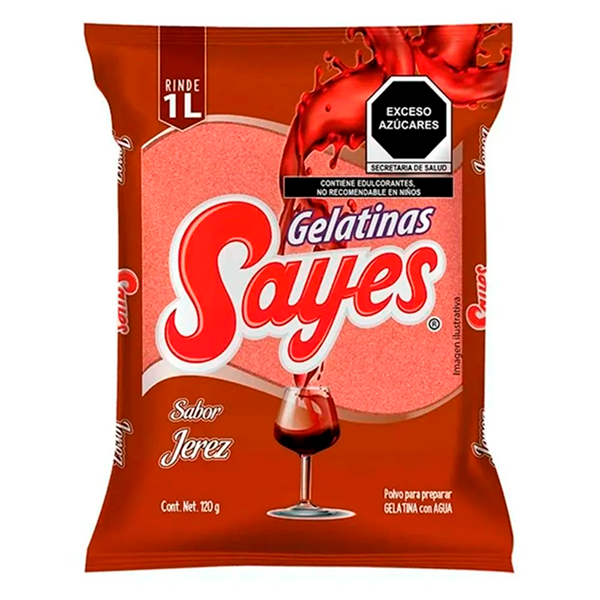 Gelatina Sayes Jerez Agua De 120 Grs. Producto Elaborado Por Mezcla De Azucar, Grenetina Aditivos Colorantes Y Saborizantes Artificiales En Granulos O Polvo Envasado Para Preparar En Agua.