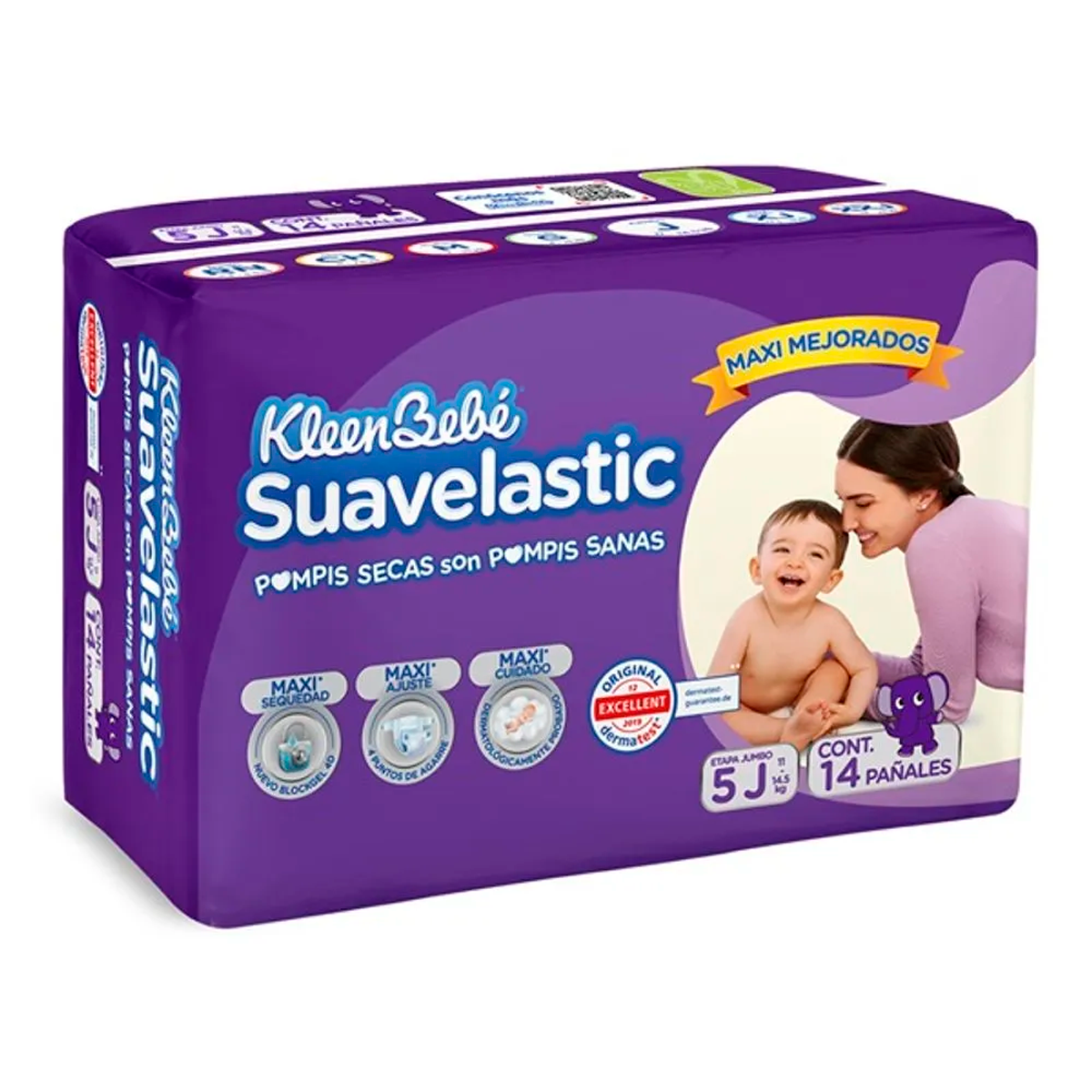 Pañales Kleen Bebé Suavelastic Max, Jumbo, De 14 Piezas, Suavidad Para Las Pompis De Tu Bebé, Nuevos Canales Que Distribuyen Líquidos Con Block Gel Para Anti Derrame, De Uso Fácil.